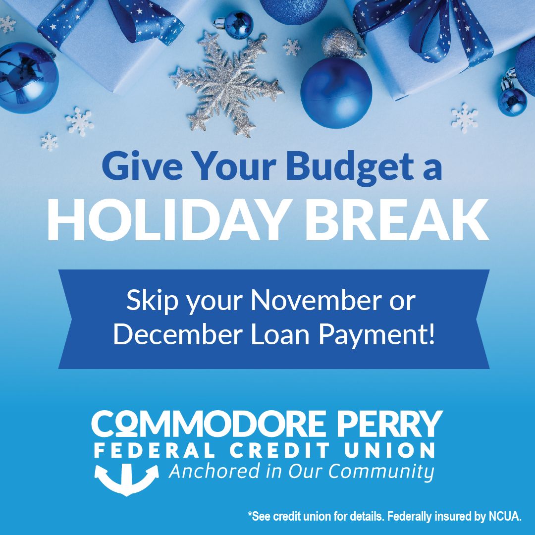 *Skip-a-Payment is only available for loans paid current and can only be used for payments due in November or December. Skip-a-Payment can only be used for future loan payments and cannot reverse a loan payment that has already been processed. Loan eligibility requirements for this program must be met. Home equity lines of credit, mortgages, and VISA credit card payments are excluded from this program. Loans that have been modified through the Financial Bridge Program are ineligible for Skip-A-Payment.